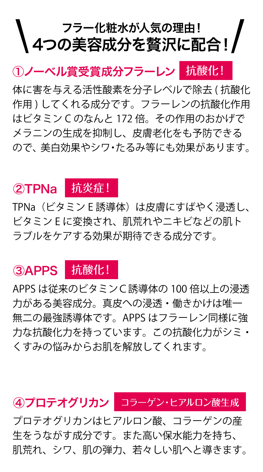 強力な抗酸化力をもつ「フラーレン」、次世代型ビタミンC「APPS」、高浸透型ビタミンE誘導体「TPNa」、ヒアルロン酸・コラーゲン産生を促す「プロテオグリカン」をバランス良く配合!